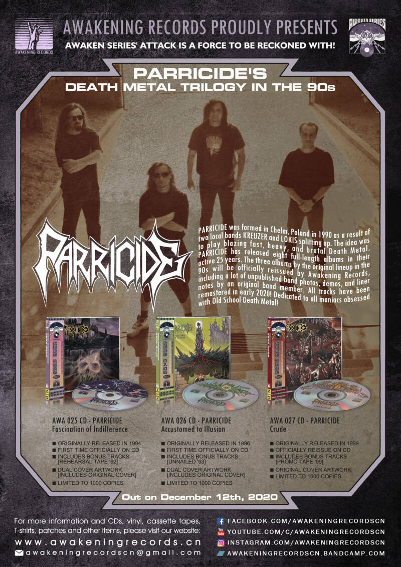Parricide was formed in Chełm, Poland, in 1990 as a result of two local bands, Kreuzer and Lokis, splitting up. The idea was to play blazing fast, heavy, and brutal Death Metal. Parricide has released eight full-length albums in their active 25 years. The three albums by the original lineup in the 90s will be officially reissued by Awakening Records, including a lot of unpublished band photos, demos, and liner notes by an original band member. All tracks have been remastered in early 2020! Dedicated to all maniacs obsessed with Old School Death Metal!